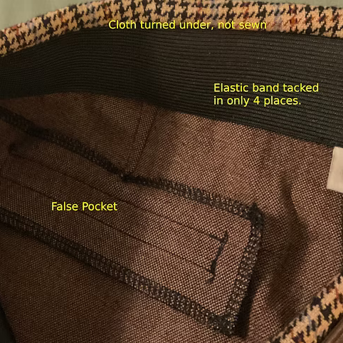 Look for extras. Does the garment come with a spare buttons? Is there generous fabric at the seams? Manufacturer’s try to save fabric by sewing very close to the edge. This is done because, over thousands of garments, the savings really do add up. What it does to you is result in a seam that cannot be let out ANY, and also a seam that, if not serged, can quickly unravel down to the stitching, ruining the entire garment. At key stress areas, does the garment have facing fabric sewn in to strengthen the construction?